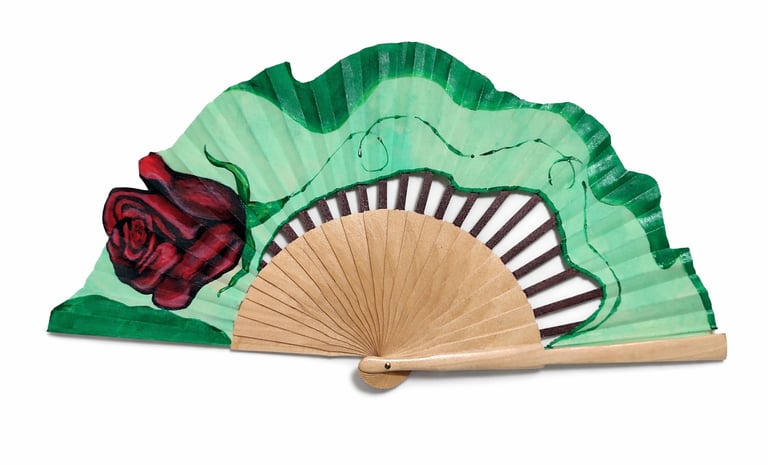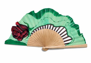Piezas pintadas a mano cuidadosamente recortadas, transformando la forma tradicional en algo vivo, único e irrepetible. El borde deja de ser límite para convertirse en gesto artístico, en movimiento, en identidad. No hay moldes. No hay repeticiones. Cada abanico existe una sola vez.